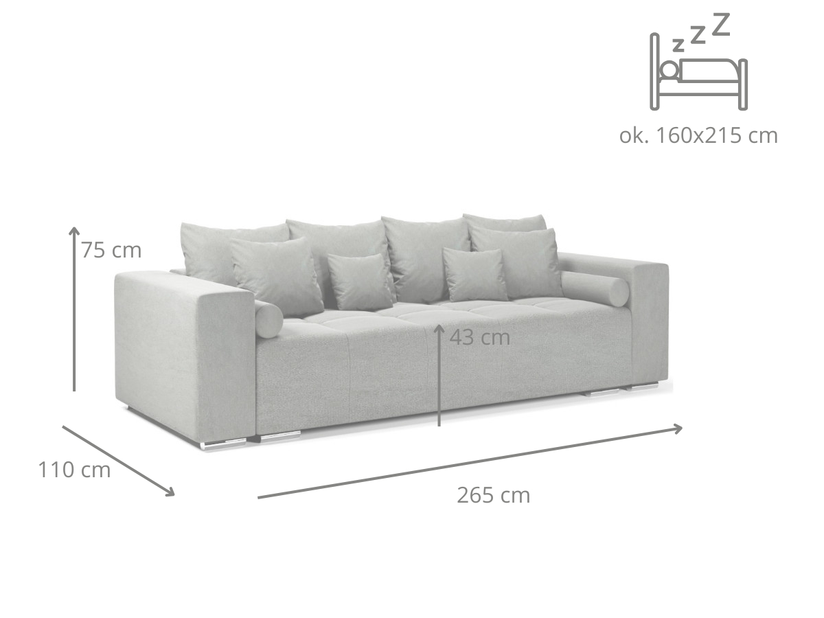 4-Osobowa Kanapa 265 cm – Sofa TILIA z funkcją spania oferuje przestronną powierzchnię 160 × 215 cm, porównywalną z dwuosobowym łóżkiem, dzięki czemu idealnie sprawdzi się zarówno dla domowników, jak i dla gości. Siedzisko ma średnio miękką twardość, co zapewnia komfortowy wypoczynek, a jednocześnie stabilne podparcie ciała podczas snu.