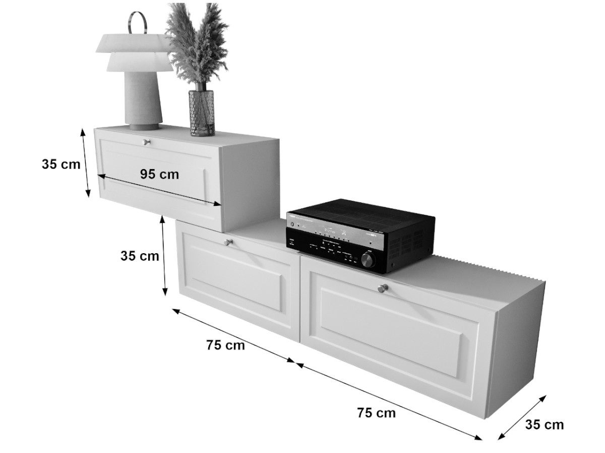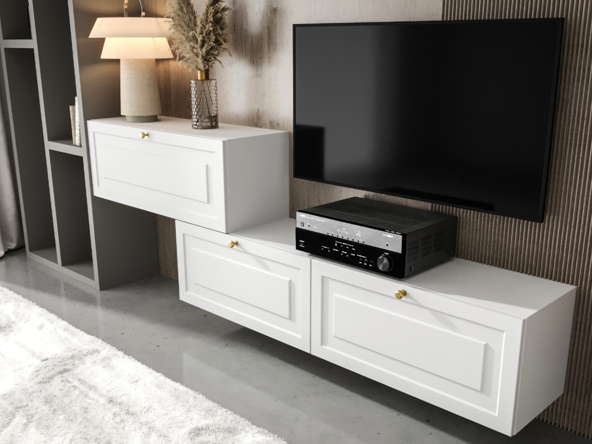Białe Meble RTV CORIA to zestaw składający się z 3 niezależnych segmentów wiszących – szafek RTV – które możesz zamontować symetrycznie lub w nieregularnym układzie, dopasowując je do rozmiarów pomieszczenia, wysokości telewizora czy indywidualnych preferencji. Wisząca forma mebli zapewnia lekkość wizualną i sprawia, że całość wygląda nowocześnie i przestronnie.