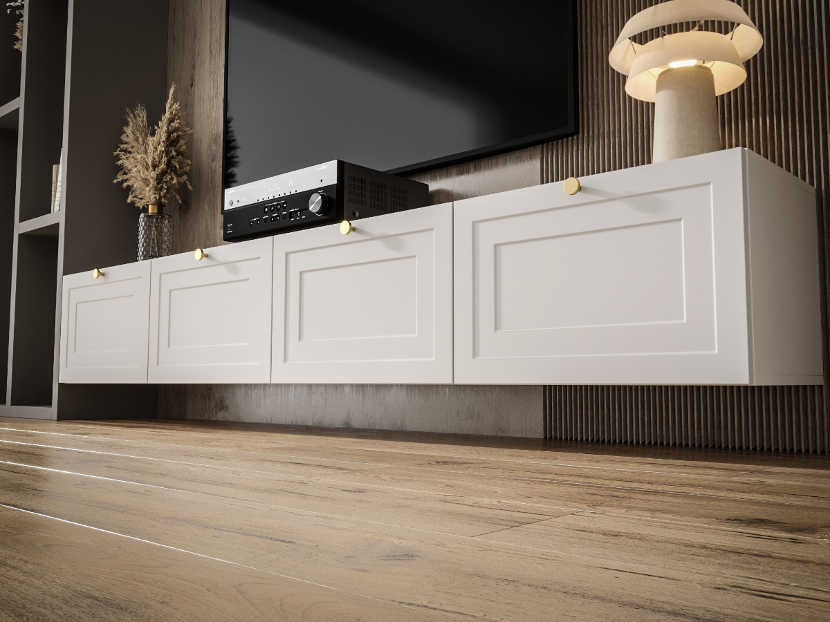 Biały Zestaw RTV 220 CM MADRYT to zestaw składający się z 4 niezależnych segmentów wiszących – szafek – które możesz zamontować symetrycznie lub w nieregularnym układzie, dopasowując je do rozmiarów pomieszczenia, wysokości telewizora czy indywidualnych preferencji. Wisząca forma mebli zapewnia lekkość wizualną i sprawia, że całość wygląda nowocześnie i przestronnie.