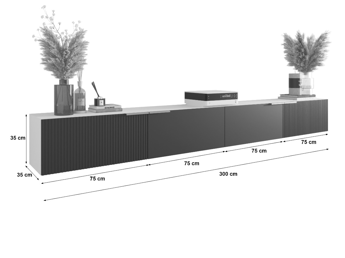 Biały Zestaw Szafek RTV 300 CM CAPRI – Ten nowoczesny, wiszący zestaw RTV o szerokości 300 cm to połączenie minimalistycznej formy z efektownym wykończeniem. Składa się z czterech niezależnych segmentów, które można dowolnie konfigurować, tworząc idealną kompozycję dostosowaną do wnętrza i własnych potrzeb. Jego największym atutem są frezowane fronty typu lamele, które nadają całości wyjątkowego charakteru i wyrazistego stylu.