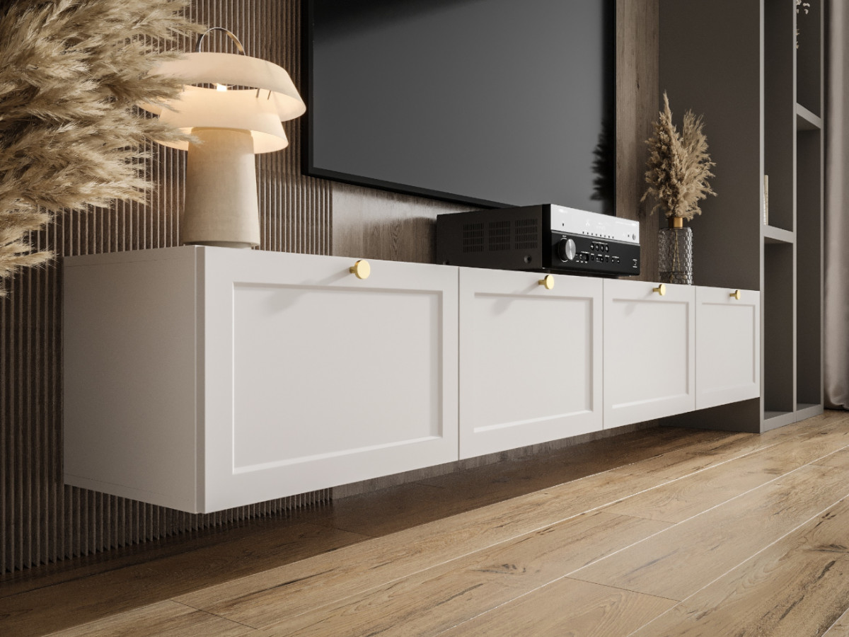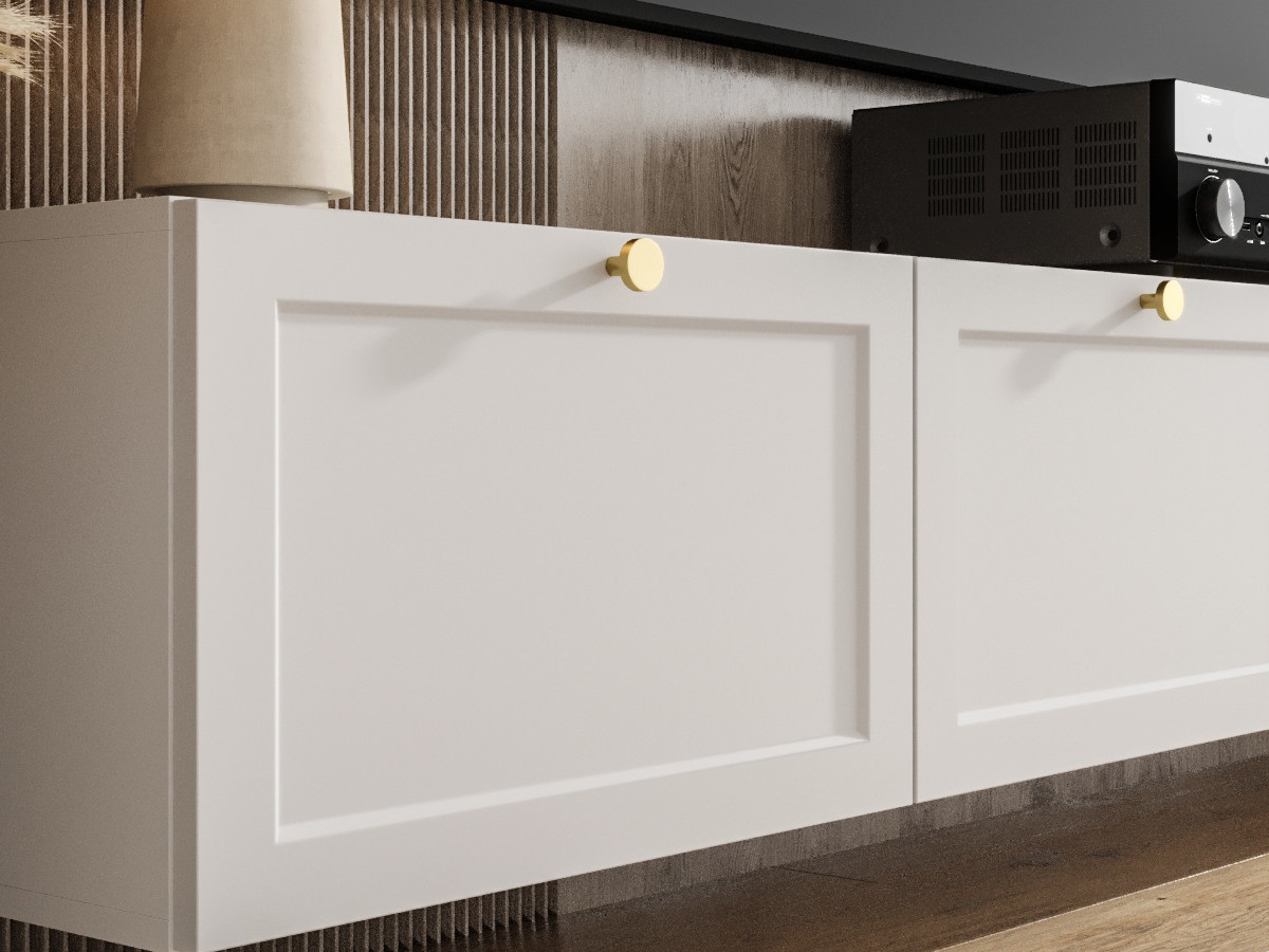 Każdy segment wyposażony jest w zamykany front, który skutecznie ukrywa sprzęt RTV, przewody, dekodery, konsole czy inne akcesoria. Dzięki temu łatwo zachować porządek i minimalistyczny wygląd strefy wypoczynkowej.