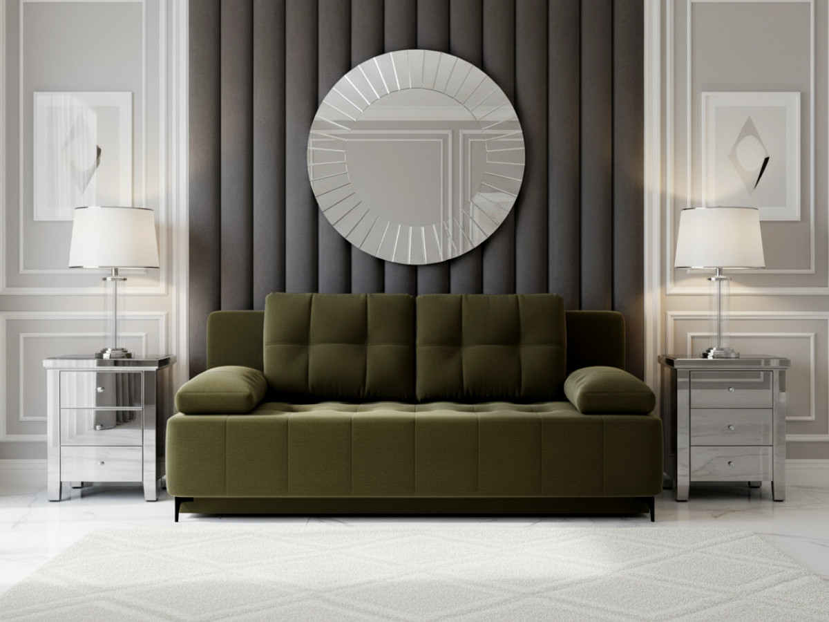 Kanapa Rozkładana 202 cm VIKKA – Mebel o długości 202 cm to praktyczna, 3-osobowa sofa zaprojektowana z myślą o oszczędności miejsca. Mechanizm rozkładania pozwala szybko zmienić sofę w wygodne miejsce do spania, co czyni ją funkcjonalnym meblem do pokoju młodzieżowego. Mimo że Kanapa Rozkładana 202 cm VIKKA jest 3-osobowa, jej konstrukcja jest stosunkowo kompaktowa, więc dobrze sprawdzi się w mniejszych salonach, kawalerkach i pokojach uczniowskich. Brak boków i wolnostojący charakter sofy daje dużą swobodę ustawienia – można ją postawić prosto na środku pokoju lub przy ścianie. Wnętrze siedziska oparte na sprężynach bonellowych zapewnia równomierne podparcie i trwałość, co wpływa na dłuższą żywotność mebla.