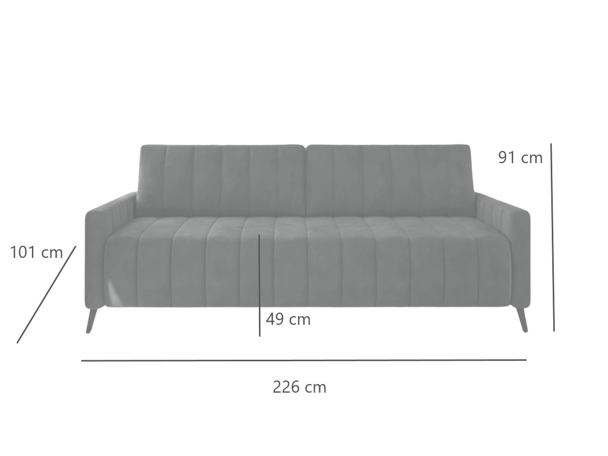 - Wymiary 226x91x101 cm – sofa 3-osobowa zapewnia przestrzeń do relaksu w ciągu dnia, a po rozłożeniu oferuje wygodne miejsce do spania.