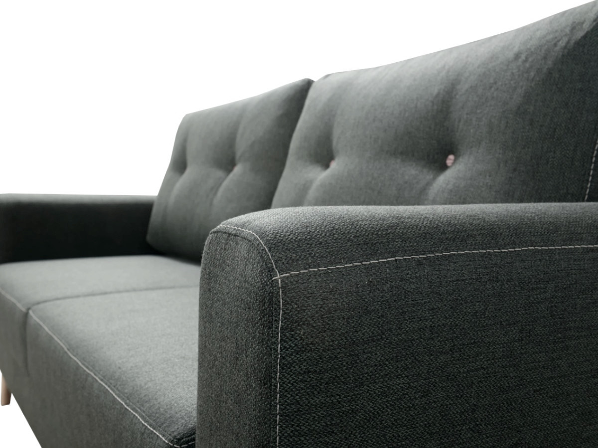 Klasyczna Kanapa Z Funkcją Spania BIELLA z wbudowanym pojemnikiem to idealne rozwiązanie do niewielkich mieszkań, kawalerek czy pokoi dziecięcych, gdzie liczy się każdy centymetr przestrzeni. Ponadto pozwala on zaoszczędzić miejsce w szafach i komodach, przenosząc część przechowywanych rzeczy do pojemnika w kanapie.