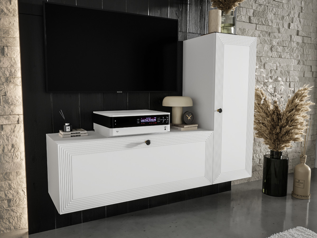 Mała Meblościanka RTV 130 CM MERIDA to zestaw składający się z 2 niezależnych segmentów wiszących – szafek – które możesz zamontować symetrycznie lub w nieregularnym układzie, dopasowując je do rozmiarów pomieszczenia, wysokości telewizora czy indywidualnych preferencji. Wisząca forma mebli zapewnia lekkość wizualną i sprawia, że całość wygląda nowocześnie i przestronnie.