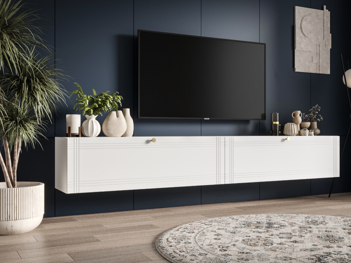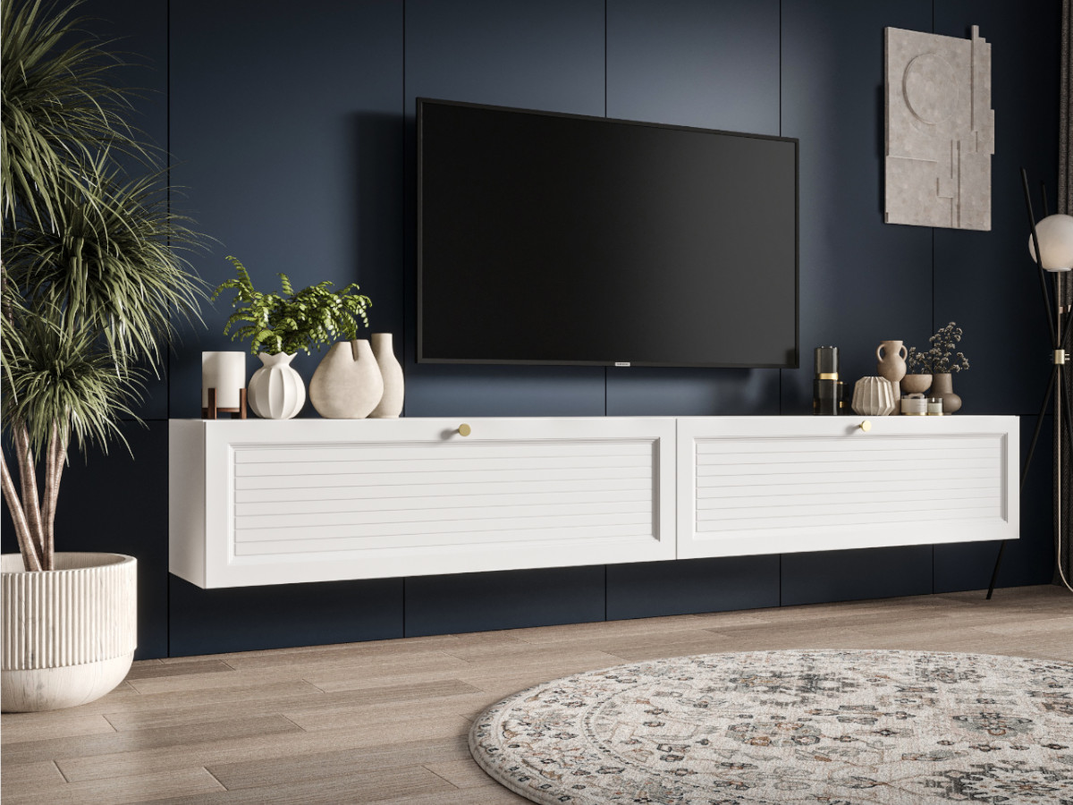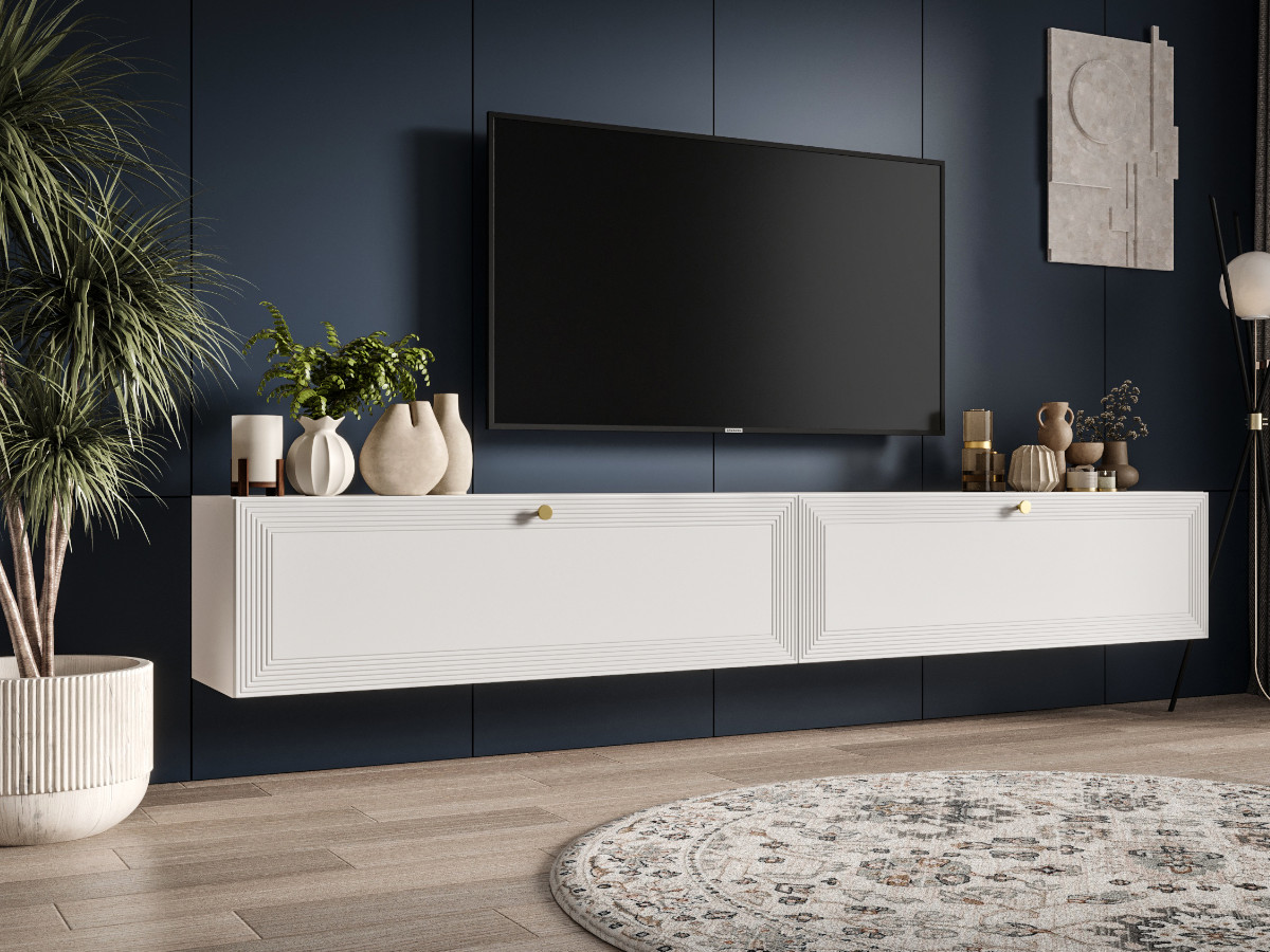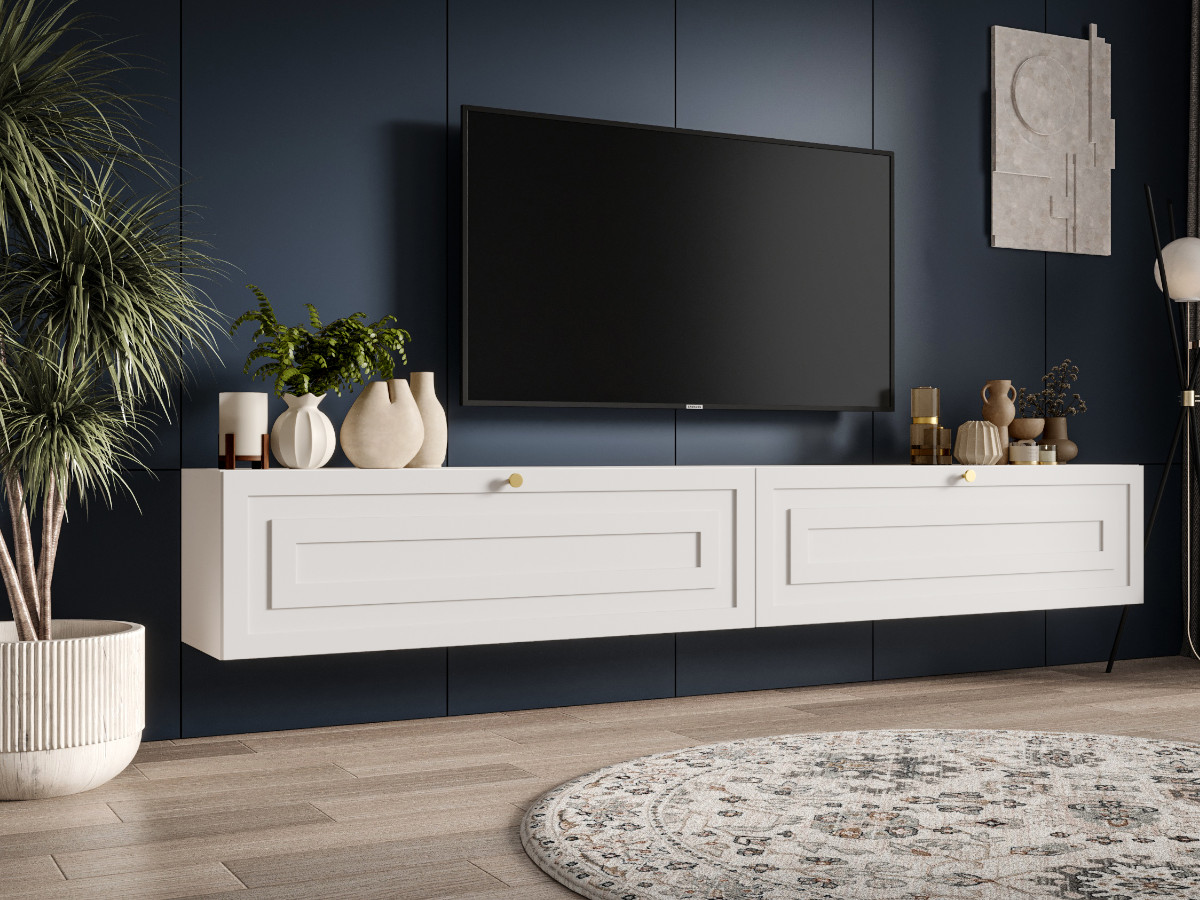 Mały Zestaw RTV 230 CM Białe Szafki Wiszące + Fronty Frezowane Malowane MDF 18 MM EKWADOR