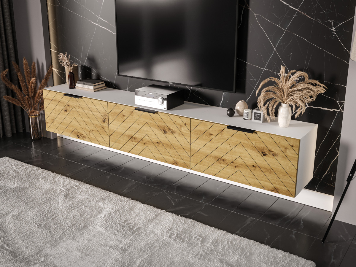 Meble RTV 225 cm MONACO to zestaw składający się z 3 niezależnych segmentów wiszących – szafek – które możesz zamontować symetrycznie lub w nieregularnym układzie, dopasowując je do rozmiarów pomieszczenia, wysokości telewizora czy indywidualnych preferencji. Wisząca forma mebli zapewnia lekkość wizualną i sprawia, że całość wygląda nowocześnie i przestronnie.