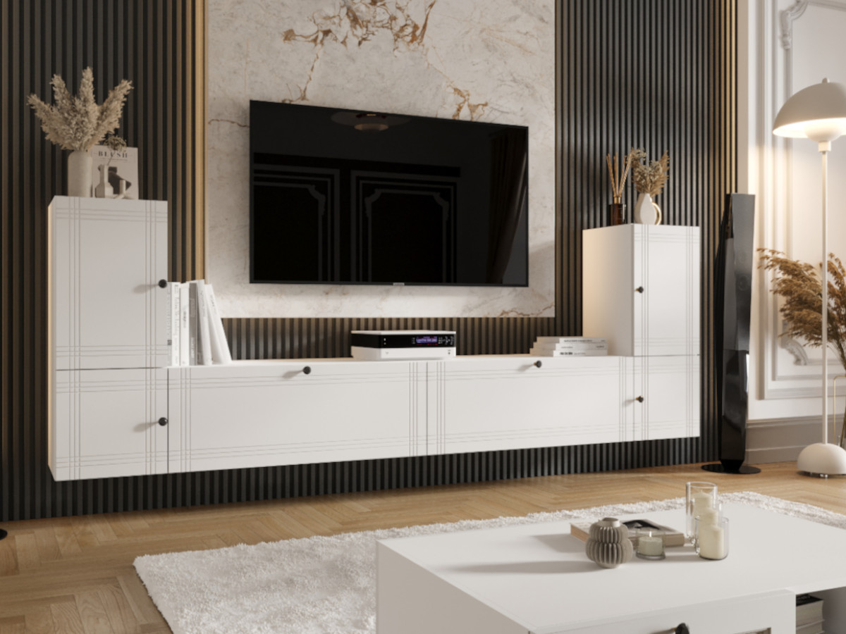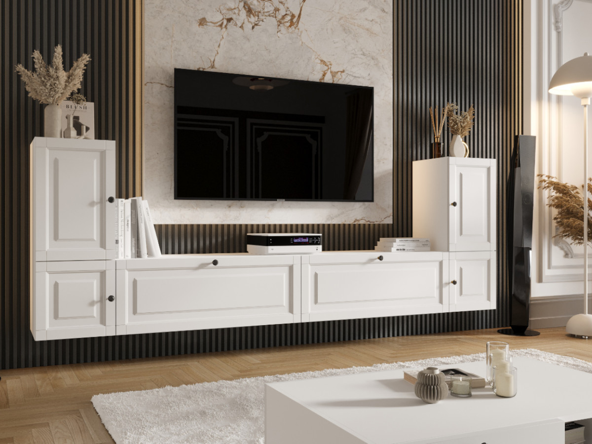 Meblościanka biała to stylowe i funkcjonalne rozwiązanie do nowoczesnych oraz klasycznych wnętrz. Wykonana z wysokiej jakości płyty MDF o grubości 18 mm, posiada frezowane fronty, które nadają jej eleganckiego i ponadczasowego charakteru. Meblościanka została wyposażona w praktyczne szafki, półki oraz zamykane schowki, co ułatwia organizację przestrzeni i przechowywanie różnych przedmiotów.