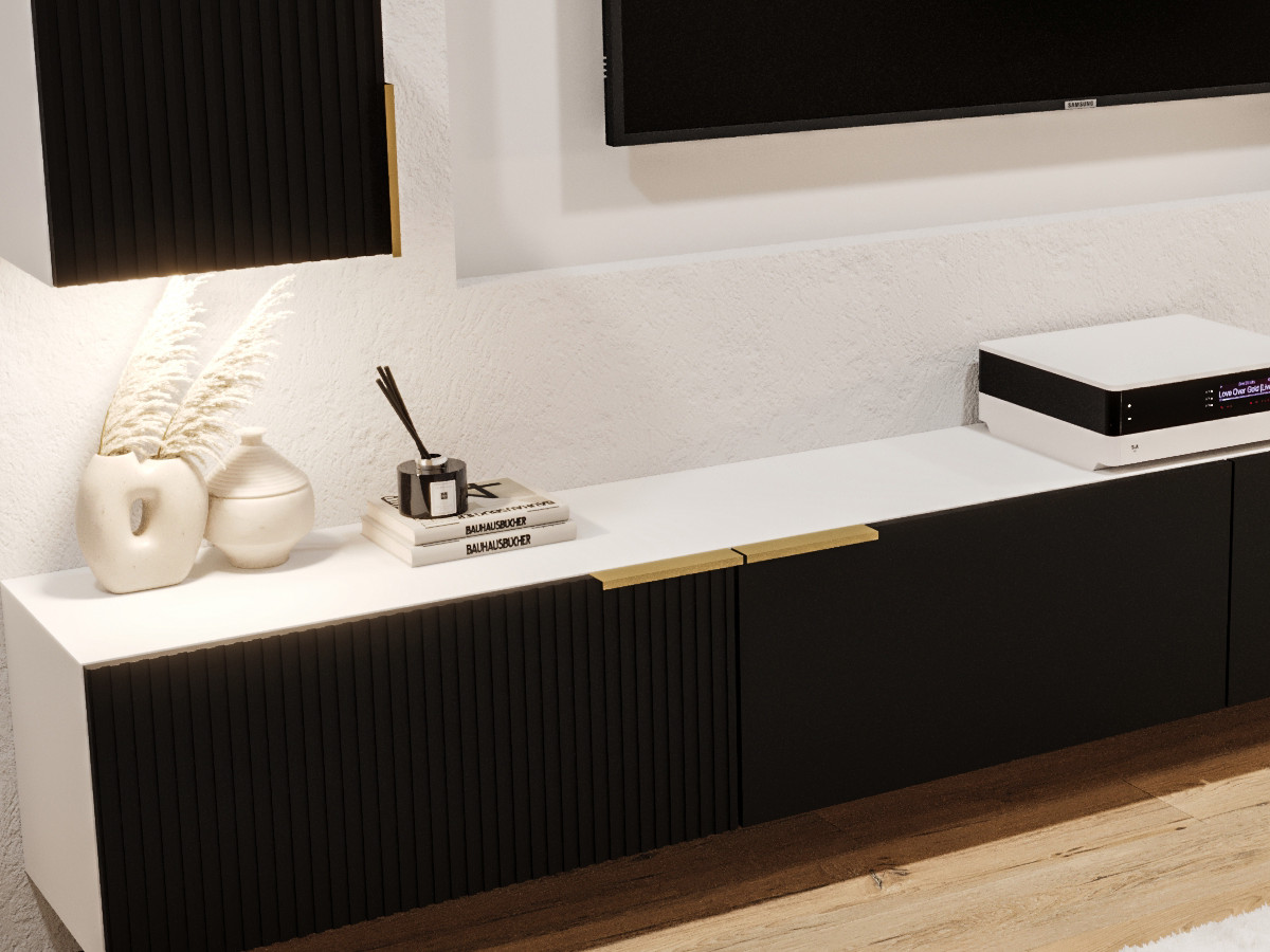 Nowoczesna Meblościanka RTV 300 CM TOKYO to zestaw składający się z 6 niezależnych segmentów wiszących – szafek – które możesz zamontować symetrycznie lub w nieregularnym układzie, dopasowując je do rozmiarów pomieszczenia, wysokości telewizora czy indywidualnych preferencji. Wisząca forma mebli zapewnia lekkość wizualną i sprawia, że całość wygląda nowocześnie i przestronnie.