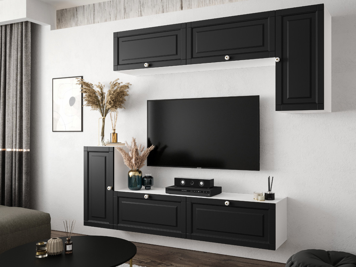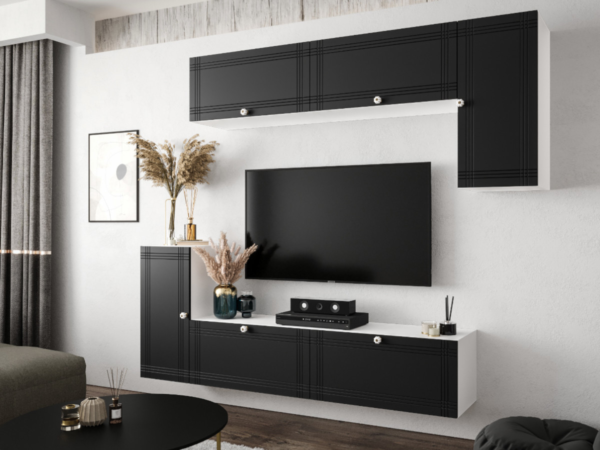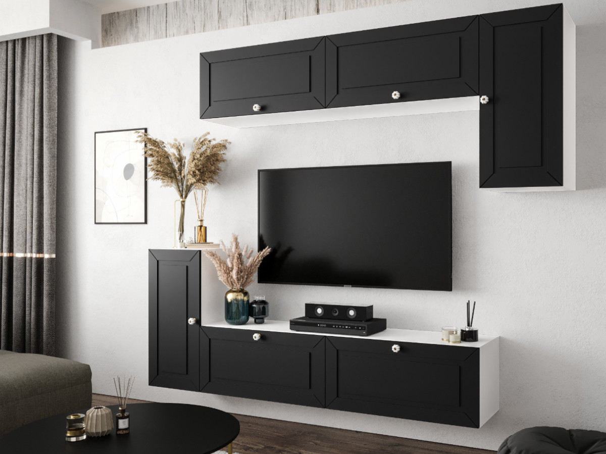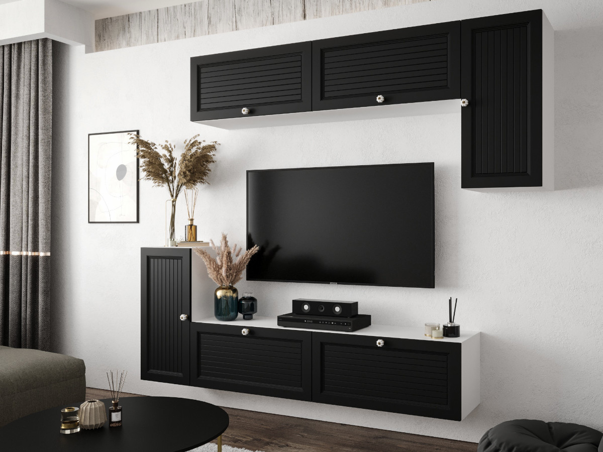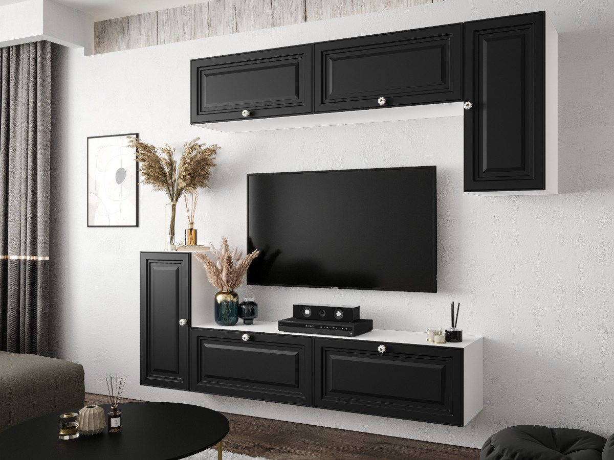 Nowoczesny Zestaw Mebli RTV Meblościanka Wisząca Do Salonu Biało Czarna 200X180X35 CM + Fronty Frezowane Malowane MDF 18 MM + Wybór Wzorów NEVADA