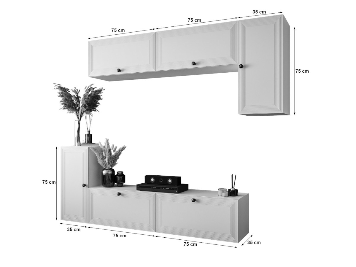 Nasz Nowoczesny Zestaw Mebli RTV NEVADA to doskonałe rozwiązanie do salonu, które pozwala na wygodne przechowywanie przedmiotów, organizację przestrzeni i stworzenie estetycznego wystroju wnętrza. Idealnie sprawdza się jako miejsce na sprzęt RTV, książki, dekoracje oraz inne akcesoria codziennego użytku.