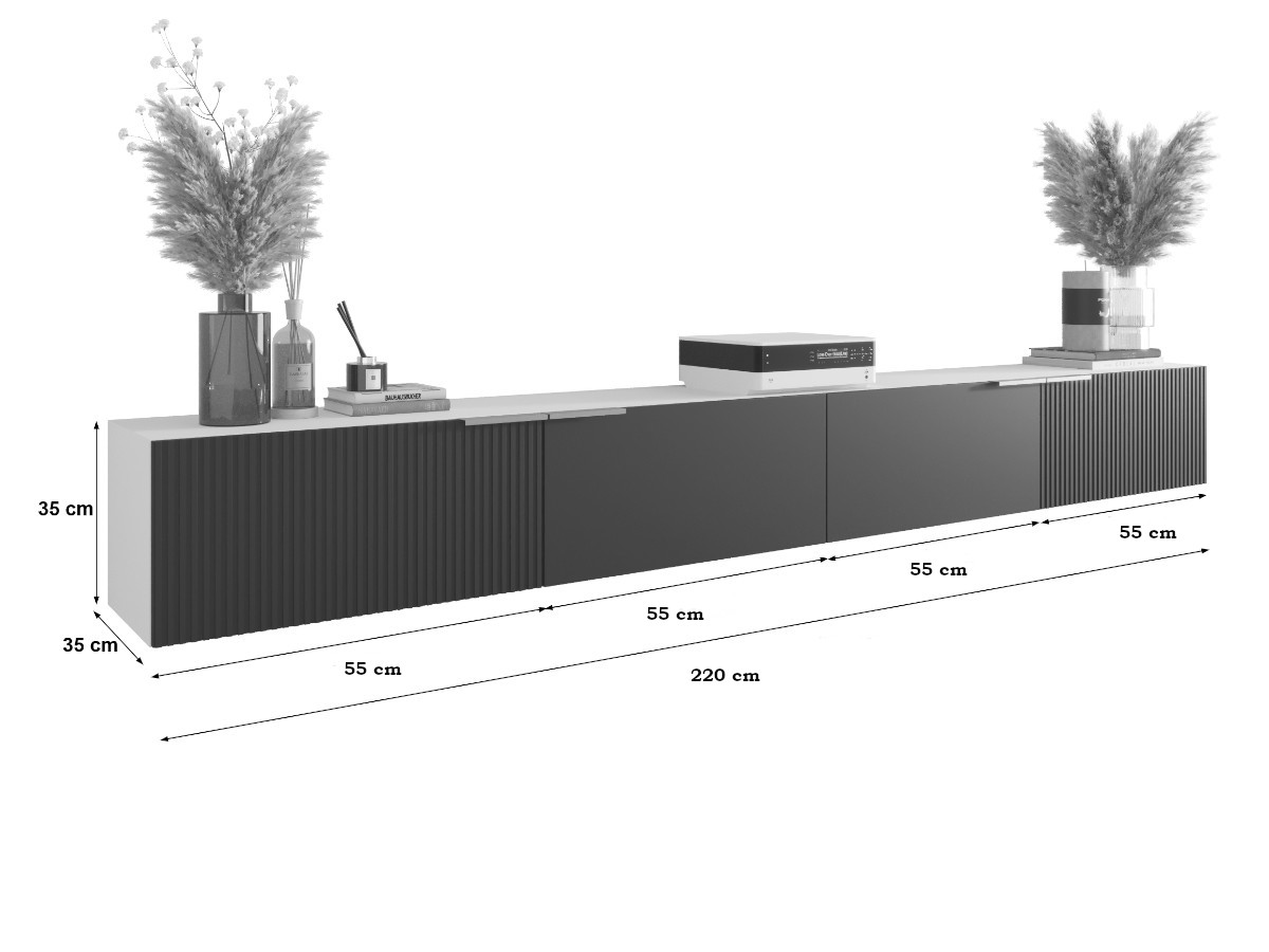 Zestaw RTV Z Lamelami 220 CM CAPRI utrzymany jest w eleganckim, białym i czarnym kolorze, które doskonale wpisują się w nowoczesne, skandynawskie i minimalistyczne aranżacje. Gładka powierzchnia korpusu kontrastuje z ozdobnymi, pionowymi frezami na frontach, tworząc wrażenie głębi i trójwymiarowości. Dzięki temu zestaw nie tylko spełnia funkcję praktyczną, ale również staje się centralnym elementem dekoracyjnym salonu.